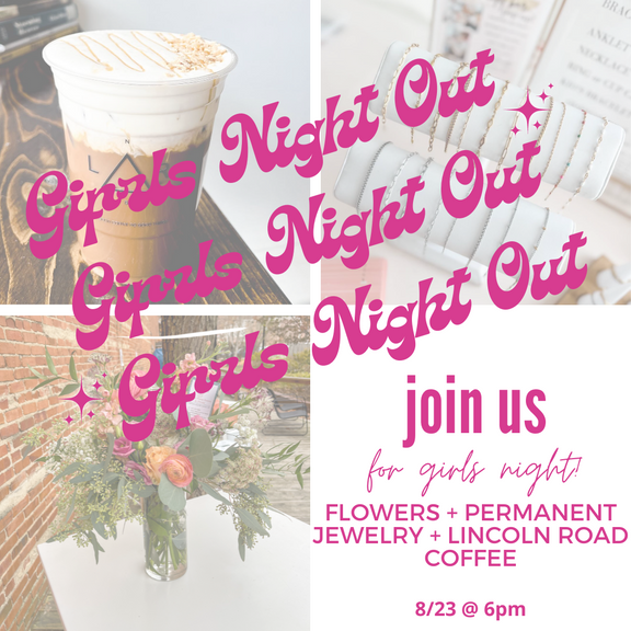 Girls Night out?! Yes Please! Grab a bestie, throw on your fav pair of lounge wear and head over to Sweet Peony for flowers, jewelry & coffee. Only 15 tickets so grab them now!